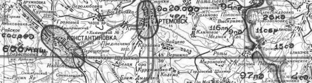 Из Купянска мы (446-й. -Авт.) перелетели в Константиновку. Аэродром там был довольно большой. Быстро оборудовали казарму, столовую, авиаремонтные мастерские, словом, все, что нужно для работы боевой авиационной части. Аэродром находился на возвышенности, а в долине - Константиновка, один из городов Донбасса, получивший в годы первых пятилеток среди прочих название "всесоюзной кочегарки". Изменилась тональность газетных сообщений: уже не скрывается, что враг рвется к жизненным центрам страны, к Донбассу, в частности. [...]