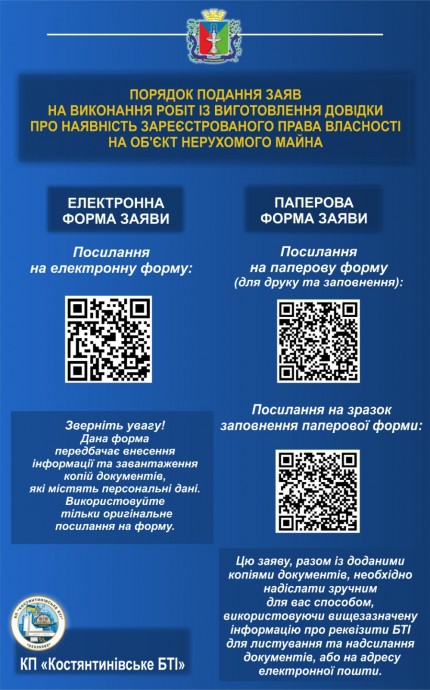Отримувач документів: КП «Костянтинівське БТІ», код ЄДРПОУ 03336580.