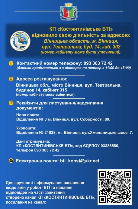 КП «Костянтинівське БТІ» оновило інформацію для мешканців громади: змінено адресу роботи у Вінниці, контакти та порядок подання заяв.
