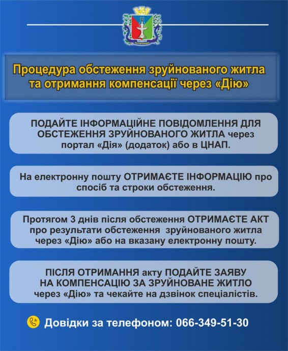 Власти общины напоминают жителям, что предоставление информационного сообщения о разрушенном жилье осуществляется через приложение или портал «Діяе» или в Центре предоставления админуслуг.
